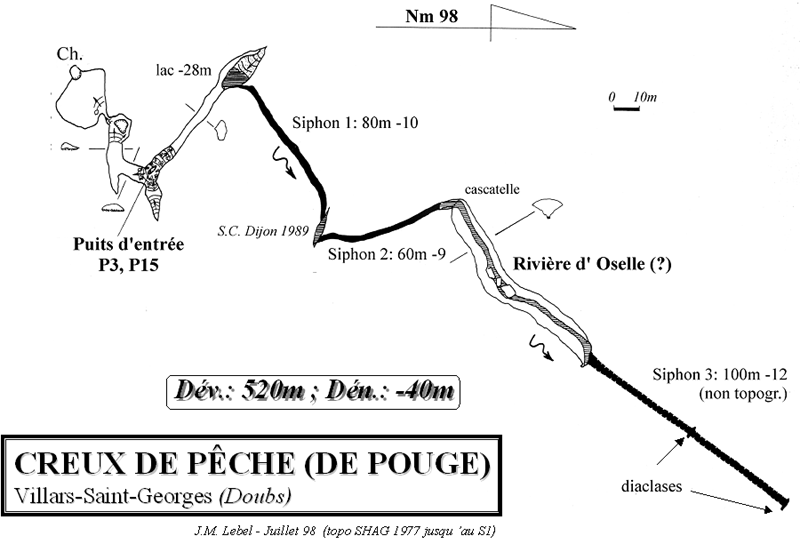 Etroiture verticale, vire, P18. Diaclase vers le Nord ouest se termine par un lac qui est le départ d'1 siphon, plusieurs fois plongé.