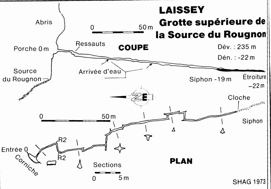 Situation : L'entrée de cette cavité se situe au dessus de la source du Rougnon et doit être atteinte en escalade Descriptif : Galerie en interstrate d'une dizaine de mètres qui se transforme en diaclase descendante . 2 ressauts de 2 mètres et 2 passages noyés en hautes eaux coupent le conduit qui se termine sur un siphon plongé par G CHORVOT 50 mètres de galerie noyée à –3m se terminant sur une étroiture. En période de crue, la cavité est noyée dans sa plus grande partie. |