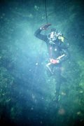 Ce puits et le laminoir qui y fait suite ne sont pas équipés en fixe. Nous plaçons habituellement 60 m de corde 10 mmm pour rabouter sur le fil d'Ariane au début de la nouvelle galerie (galerie de la Première Première). Cela évite d'arracher l'équipement à chaque crue, donne du confort pour le passage du laminoir au retour en visi réduite, et fournit un ancrage sûr pour les bouteilles de déco (le profil du trou se prête particulièrement bien à la plongée
