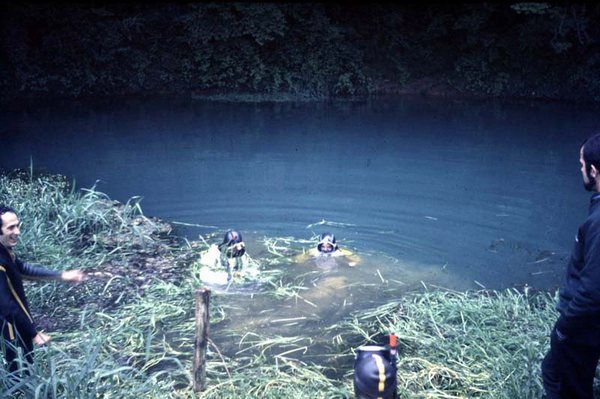 La mise à l'eau s'effectue dans une vasque d'une dizaine de mètres de diamètre environ. Un puits-diaclase étroit (1,5m x 5m) où la visibilité est
