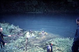 Le siphon 5 a effectivement été déniché derrière un gros bloc dans le fond de la rivière. A -3, en rive gauche, il part presque à 90° et retrouve ainsi l'axe principal NE. Au bout de 66 m de parcours quasi-rectiligne (-4) on émerge dans la suite de la rivière. Encore une trentaine de m et une bifurcation se présente : à droite une galerie active légèrement surélevée, à gauche ce qui semble être le prolongement de la rivière.