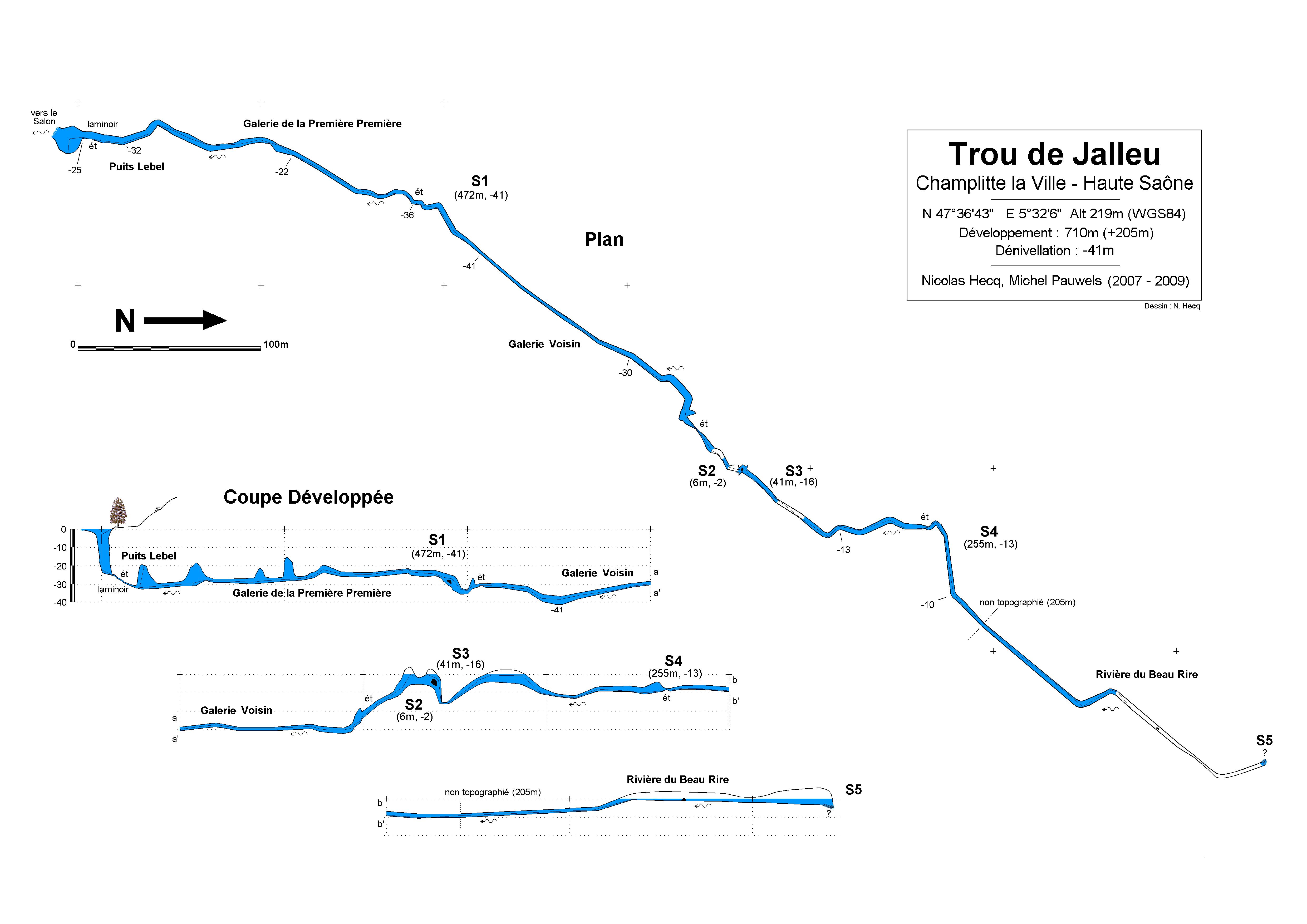 La développement topographié a été porté à 1114,5 m (dont 925,5 m de siphons), auxquels s'ajoutent 112 m estimés (dont 23 m de siphon).