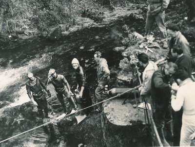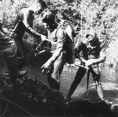 | Saint-Claude (Jura) - 25 février 1961 Le Trou de l'Abîme est une grosse source vauclusienne proche de Saint-Claude (en étiage le jour de l'exploration, son débit était de 2 500 litres/seconde). A l'initiative de Jean Colin, animateur du Spéléo-Club San-Claudien, Michel Letrône et ses équipiers du Spéléo-Club de Lyon sont venus l'explorer en scaphandre, en février 1961. La profondeur atteinte ce jour-là est de 45 m, ce qui en fait une des plongées en siphon les plus profondes de l'époque, en France |