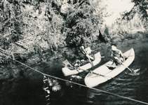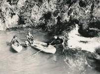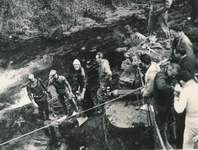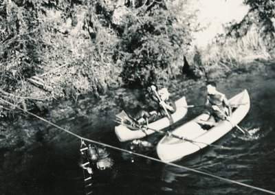 On remarque l'échelle, accrochée au câble, et descendant à -35 m. Dans l'eau, de gauche à droite : Michel Letrône, Max Martin (les deux plongeurs descendront jusqu'à -45 m) Dans les bateaux : Pierre Capieu, Maurice Allard. Cliché : D.H.L. - Collection Robert Le Pennec Trou de l'Abîme (Saint-Claude, Jura) - 25 février 1961 |