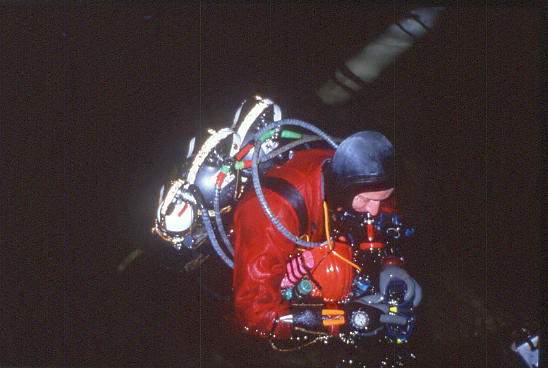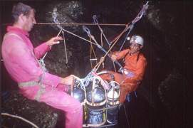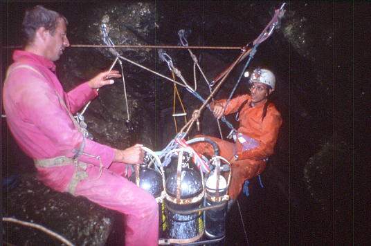 Situation Puits de 5m, escalade 5m, puits de 4m, puits de 12m, éboulis. Ruisseau à parcourir sur 1 400 m dans un méandre, jusqu'au siphon aval, à -70. Description Siphon aval Plongée du 28.07.1975 Plongée du 07.01.1990
