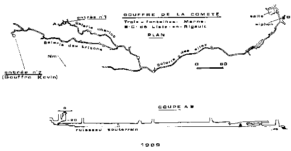 Puits de 19m d'entrée, méandre étroit de 130m puis 470m de ruisseau souterrain terminé par un siphon aval à plonger.
