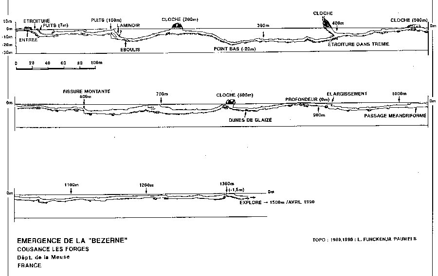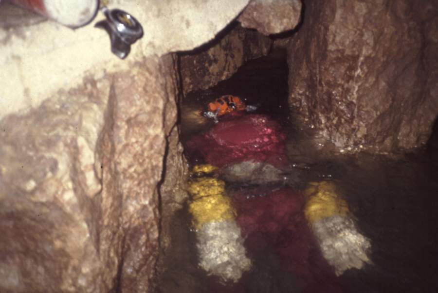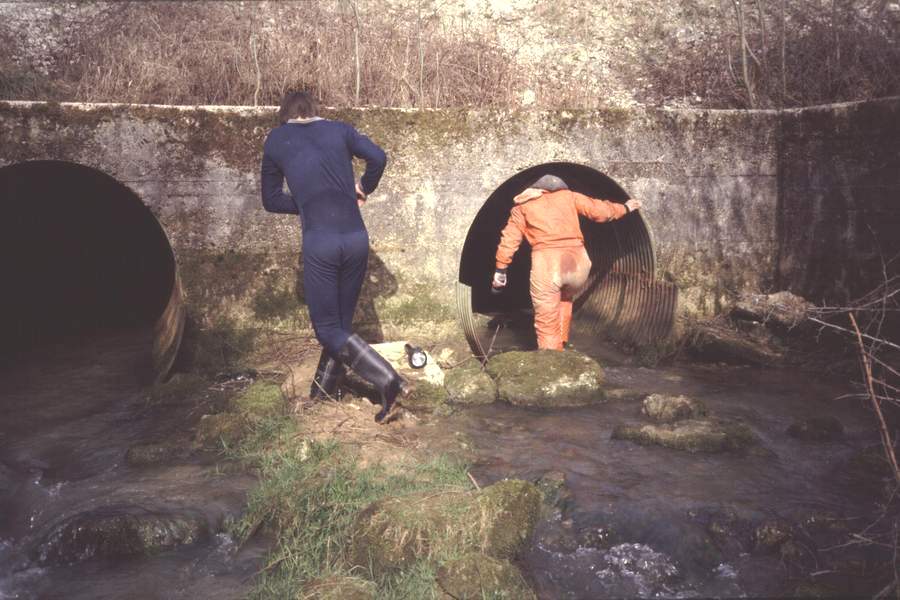 Historique L'entrée du siphon avait été visiblement désobstruée lorsque Michel Pauwels et Luc Funcken entreprennent leurs premières plongées en 1989. Aidés par d'autres plongeurs belges : Jean-Pierre Bastin, Roger Cossemyns et Dominique Ivens, ils désobstruent une trémie à 30 m (-6), une seconde à 390 m (-10), et poursuivent l'exploration jusqu'en 1991. Arrêt sur rien à 1670 m de l'entrée, à proximité de la surface. En 1993 une dernière série de plongées permet de lever la topographie jusqu'au point 1670 et de gagner encore 18 m pour enfin sortir le siphon.