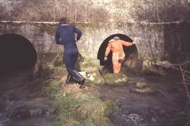 La flaque d'entrée du siphon ne paie vraiment pas de mine (maximum 1 x 2 m) . Elle se situe sous un talus routier, on y accède par les buses de canalisation des eaux. En crue et par fort débit, un flot tantôt clair, tantôt boueux, peut sortir de la flaque ; mais la plupart du temps il s'agit d'eau stagnante, l'exsurgence des eaux se faisant dans le lit du ruisseau plus en aval. Directement après la flaque, on doit se faufiler entre des blocs sur quelques mètres (un bi 2 x 12 passe tout juste) pour arriver au sommet d'un premier puits de 7 m. A sa base, la galerie se dirige vers le nord et mène, après 30 m, à un nouvel éboulis (désobstruction) qu'il s'agit de franchir en se glissant entre les blocs. La suite conduit peu après à un passage surbaissé sur la droite qui livre accès à une galerie haute de plus de 2 m. Vers le point 100, un puits de 10 m de profondeur donne accès à un point bas (-15 m) , via un laminoir tapissé de graviers et un nouveau passage éboulé. A cet endroit, le conduit reprend des dimensions plus importantes et remonte en pente douce sur de l'argile pour atteindre le point 200 à -3, base de la première cloche. La galerie continue tout droit et au point 250 (-5), un plan incliné permet d'accéder à un nouveau passage surbaissé (-20 ). La suite jusqu'au point des 390 m est plus malaisée : nombreuses écailles rocheuses dans le chemin, diverticules secondaires, éboulis, passages surbaissés. Elle se situe entre -20 et -15. Au point 390, l'eau surgit d'entre les blocs (des déblais ont été effectués), il faut franchir une grosse trémie en se faufilant dans l'éboulis. Au-delà, le sol se redresse, il est tapissé d'éboulis et d'argile. Sur la droite on accède à la grande cloche via des talus de boue; sur la gauche, vers -10, la galerie s'oriente vers le N-0. Le sol est toujours tapissé d'argile et quelques élargis sements encombrés d'éboulis égaient le passage. Une douce remontée mène à -2 à la base de la cloche du point 500. La galerie continue tout droit vers le nord. Jusqu'au point 600, elle présente la même morphologie : assez plate, sur joints et parsemée d'éboulis. A 600 m un élargissement livre différentes possibilités. Du plafond, une diaclase monte verticalement ; devant, le sol se dérobe et on descend de 4 a 5 m ; vers le N-E, un passage colmaté après 30 mètres. La suite continue vers le Nord, la galerie devient plus haute et ressemble à un conduit sur fractures. Par endroits, la base de la galerie s'élargit et elle présente ainsi un joli profil en "T" inversé. Vers le point 700, un talus de glaise oblige à monter dans la fracture (+/- 50 cm de large) pour redescendre directement après dans la galerie qui continue avec la même morphologie que précédemment jusqu'à environ 780 m. A cet endroit, un barrage de blocs oblige une nouvelle fois à monter et on arrive ainsi dans la cloche à 800 m (10 m de profondeur d'eau). La continuation se trouve avant la montée vers la cloche sur la droite. En descendant derrière un éboulis, un talus de graviers pend vers un passage surbaissé. Au delà, le conduit change de morphologie, il est plus bas et le sol est encombré de dunes d'argile entre lesquelles il faut passer. Un nouveau boyau surbaissé donne accès à un tronçon plus spacieux. La profondeur va diminuant jusqu'au point 880, où l'on atteint la surface sans ressortir pour autant. Jusqu'à 930 m le conduit, toujours de bonne dimension, redescend petit à petit et atteint -7. Un gros élargissement laisse voir, par bonne visibilité, la suite en contrebas sur la gauche. Jusqu'au point 970, la profondeur oscille aux alentours de 9 m, elle diminue peu après vers 1.000 m environ. Un coude à angle droit vers l'est montre une nouvelle figure de galerie : plus haute, d'aspect méandriforme (moins d'un mètre de large), on y progresse à mi-hauteur entre des parois claires pourvues de nombreuses aspérités. Après un nouvel élargissement, un talus de glaise oblige à descendre sur la droite pour atteindre -9 dans un conduit surbaissé. Au-delà, la galerie reprend des dimensions très honnêtes et se poursuit jusque 1.170 m. Ensuite elle présente des tronçons de moins en moins sinueux, et se dirige plein Nord jusqu'à 1.330 m. Au-delà, le siphon présente les mêmes caractéristiques. Seul un ébou lis aux alentours de 1.400 m rompt la monotonie en présentant une étroiture qui se franchit en raclant assez fort. Enfin, à 1.760 m, la galerie devenue assez basse bute sur un véritable mur. A droite (rive gauche) on ne trouve qu'un très court diverticule, tandis qu'à gauche un dernier palmage de 18 m permet de ressortir dans une minuscule cloche en se faufilant à travers un éboulis. De l'amont l'eau vient à travers l'éboulis en narguant le plongeur…