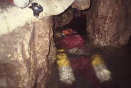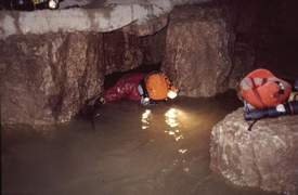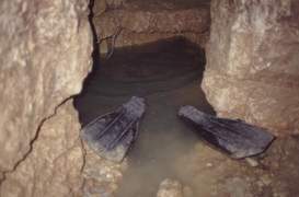 Généralités Le siphon doit être obligatoirement parcouru à la palme, la mauvaise visibilité empêche en effet l'usage de "loco". A plusieurs reprises, les retours ont été effectués en visibilité nulle ou maximum 50 cm. En très bonnes conditions, la visibilité peut atteindre 4 à 5 m à l'aller mais diminue immédiatement après un passage à cause des talus d'argile omniprésents. Plus fréquemment, la visibilité à l'aller avoisine 1 à 2 m. Au retour, les derniers hectomè tres parcourus se font à l'aveuglette et, après deux à trois cents mètres, on commence à voir sa main sur le fil. Les temps de plongée commencent à se faire de plus en plus longuets. Si une heure est utile pour aller et revenir de 500 m, il faut au moins 4 bonnes heures de plongée pour atteindre la cloche terminale et en revenir. Le matériel à utiliser devient également considérable. L'usage de grosses bouteilles dorsales est malaisé de par la présence des étroitures, des éboulis, et passages surbaissés... Les pointes s'effectuent avec un bi 12 litres et une bouteille ventrale (souvent poussée devant) de 20 l jusqu'à 500 m, où une autre bouteille relais de 20 l, préalablement déposée, permet de tirer sur ses palmes jusqu'à 1.000 ou 1.100 m avant d'attaquer le bi, qui passe tout juste dans l'étroiture de 1.400m. A noter qu'à ce jour (avril 2007), la trémie de 390 m s'est fortement laissée aller et que le passage n'est plus possible qu'avec des bouteilles latérales. Bibliographie 1974 - Etude des circulations dans les calcai res portlandiens des vallées de la Saulx et de l'Ornain / P. Personnet.- B.R.G.M., Service Géologique Régional Nord-Est. 1990 - Rapport d'activités 1989 / U.B.S., Com mission de Plongée Souterraine.- p. 12-16. 1990 - Plongées en Meuse et Haute-Marne / L. Funcken, M. Pauwels.- Regards, no 7.- p. 13-21. 1993 - Rapport d'activité des plongeurs belges 1990-1992 / U.B.S., Commission de Plongée Souterraine.- p. 6-8. 1994 - Les activités des plongeurs belges en Meuse / Haute-Marne en 1987-1993 , Sous le Plancher, bull. de l'A.S.E. n° 9