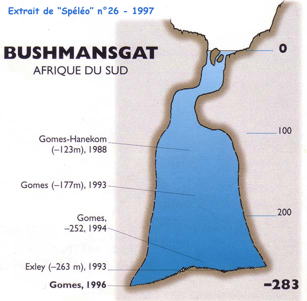 Situation Au nord de la province du Cap. Altitude : 1550m Historique Nous n'avons pas retrouvé d'informations sur les explorations menées avant 1981. Le plongeur sud-africain Nuno Gomes entame une série de plongées en 1981, dont la profondeur augmente progressivement. En 1988, accompagné de Diane Hanekom, il atteint –128 en respirant du Trimix, puis –177 en 1993. En 1991, une sonde lesté avait été descendue jusqu'à –264. L'année suivante, l'américain Sheck Exley (qui vient d'atteindre –267m au Mexique) descend à –252. Les problèmes de décompression rencontrés lors de la remontée amènent une reconsidération des procédures de décompression. Après avoir topographié (sonar et mini sous-marin télécommandé) le gouffre, Nuno Gomes atteint un sol argileux par – 283 le 23 août 1996. Description Bushmangat serait l'une des plus grandes salles noyées (voire la plus grande) de la planète. Le fond, mesuré au sonar, atteindrait 250m de long pour 70 de large. La descente est verticale de –52 à –260. Un sol argileux déclive glisse à –283, le point le plus profond atteint à ce jour dans la cavité. |