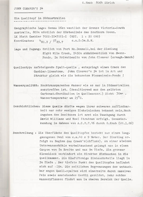 Vu sa situation particulière dissimulée à la vue, cette source n'est connue que par très peu de personnes. Selon le propriétaire, David Williams et Noël Stratmann viennent voici peu d'y effectuer une plongée. Une exploration a été effectuée par O.Knab dans le cadre du projet ASMF 86.