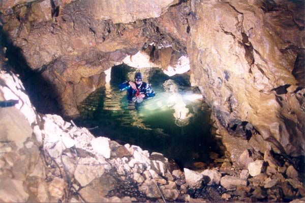 A 55m. de l'entrée de la cavité, un passage bas est rédibitoire pour un plongeur équipé en bi-dorsal. A revoir en technique anglaise.