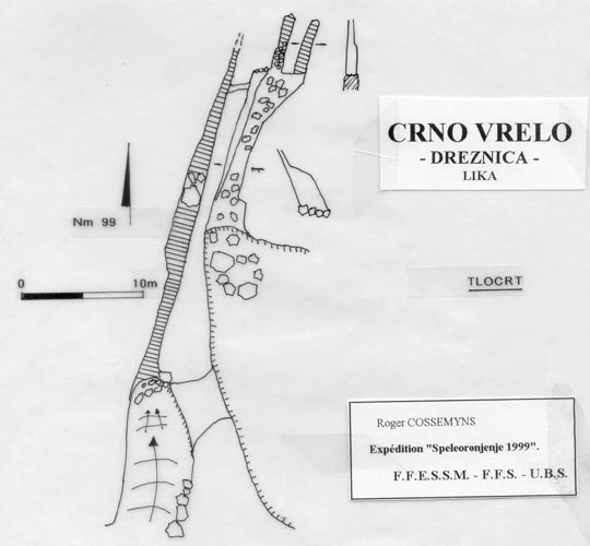 Deux porches butent sur des diaclases aquatiques impénétrables. Cette source nous avait été indiquée par le président de la fédération croate, pour développer 110m jusqu'à -54 avant d'amorcer une remontée. |