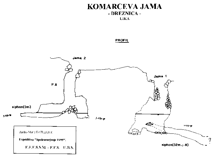 Situation Avant Dreznica, bifurquer sur la droite et suivre une mauvaise piste jusqu'au poljé, qu'il faut suivre durant 3 km. pour atteindre CRNO VRELO. Les deux cavités sont situées 150m. à l'est de cette dernière, distantes de moins de 30m. l'une de l'autre. Description Komarceva jama 1: Après desescalade sur une trémie dangereuse, un siphon très étroit s'engage entre les blocs sur 32m (-8). L'instabilité de la trémie nous a conduit à abandonner les explorations. Komarceva Jama 2: Puits de 8m. débouchant sur un écoulement dont seul le siphon amont est brièvement pénétrable (3m., arrêt sur fracture). La découverte de protées, jamais localisés dans ce poljé auparavant, a permis d'affiner la connaissance des zones peuplées par ce fascinant animal. |