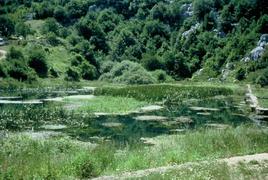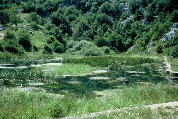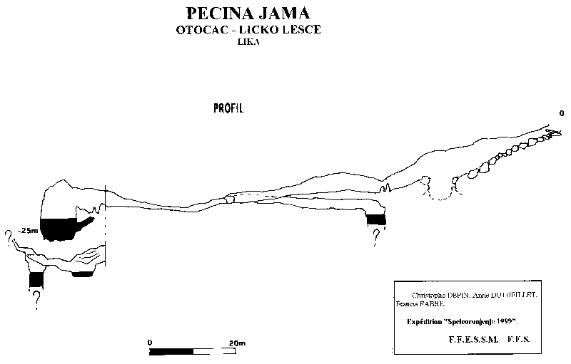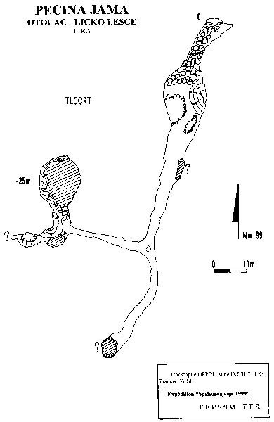 Situation Remonter le poljé de la Gacka par la rive gauche (commune de Licko Lesce) jusqu'à enjamber un lit de rivière, passé lequel un route oblique vers le versant ouest de la vallée. On accède au plan d'eau par une piste bien tracée, au-dessus duquel il faut remonter à flanc de coteau pour trouver l'entrée de la cavité. Description Après avoir franchi le porche d'entrée, on entame une désescalade entre des blocs de taille moyenne. La boue fait rapidement son apparition rendant la progression délicate. La descente se poursuit par un ressaut de 3m suivi d'un passage en petit pont (corde 6m nécessaire). La galerie est alors tapissée de traces d'écoulement boueux au sol. A 70 m de l'entrée la galerie se divise en 2. La branche sud se termine après 40 m de progression glissante sur un siphon précédé d'un ressaut de 3 m (équipement nécessaire). On perçoit un éventuel passage en voûte mouillante. Siphon non plongé. La branche ouest nécessite un passage à 4 pattes sur une vingtaine de mètre entre les concrétions. On poursuit par une petite escalade boueuse et le galerie se divise de nouveau. Au nord, après avoir franchi une étroiture entre quelques gros blocs on arrive a un ressaut de 2 m donnant sur lac (10 x 15 x10 m.). Le coté ouest du lac est bordé par de grandes coulées stalagmitiques. Le lac a été plongé, sa profondeur est de 10 m, il ne semble pas donner naissance à des galeries mais à juste quelques départs entre les coulées stalagmitiques qui se pincent rapidement. La température de l'eau est de 9 °C. Enfin dans la branche ouest, on atterrit dans un lac après quelques mètres de désescalade facile, le lac est profond de 70 cm, en sortie on grimpe de nouveau pour accéder à un nouveau siphon situé 2 m en contrebas (équipement nécessaire). Du coté sud une corniche semble permettre de contourner le siphon, mais son escalade est rendue délicate par la traditionnelle présence de glaise (arrêt à 5 m de haut sur "ça craint !"). Dans cette grotte la boue est omniprésente, elle rend la progression difficile et les portages deviennent vite fatiguants. La glaise ne favorise pas trop le planté de spit et l'équipement a tendance à se faire au lasso. Température de l'eau: 9°.