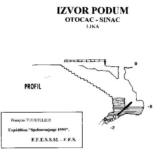 Situation Sur le bord de la route, entre Otocac et Zaluznica, à proximité du hameau de Podum, un terrain est trépané par un gueule sombre dont une partie a été couverte. Description Curieuse cavité constituée d'un canyon où des marches d'escalier ont été baties afin d'accéder au plan d'eau terminal, argileux à souhait et bouché à -2m. par un amoncellement de blocs. |