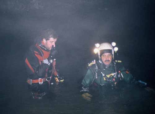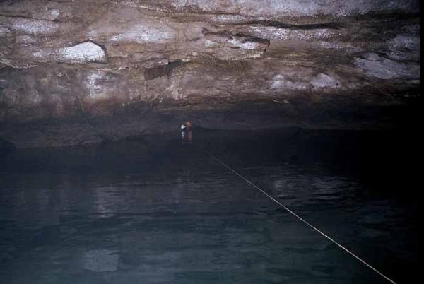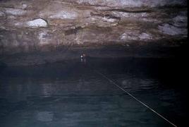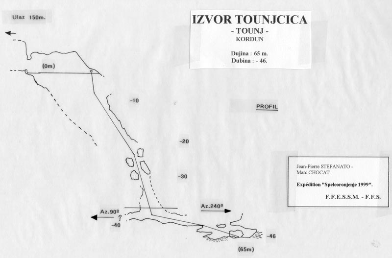 Situation Cette résurgence se trouve à l'entrée de Tounj, en venant de Brinje. Une piste, sur la gauche de la route, conduit à une carrière, avant laquelle il faut se gare en bordure d'un vallon profond. On descend par une sente dans le lit de la rivière pour accéder à l'entrée de la cavité presque visible depuis le parking. Historique La cavité est connue de longue date comme résurgence temporaire d'une importante cavité sise environ 250m en amont (Spilja u Kamenolomu > 8000 m.). Le siphon amont fut plongé le 09/06/1973 par S.MACURA et I.SEMENOV jusqu'à -27, puis dans la foulée par H.MALINAR et S.MACURA jusqu'à -33. (D'après Gordan TOMSIC Povijest speleo ronjenja, Velebiten n°18, p.17-19.) Le 18/09/1988, Téo BARISIC et Robert ERHARDT poursuivent jusqu'à -35 (D'après Zoran STIPETIC dit Patak Speleo-ronjenja u S.O. P.D.S. Velebit 1988-1995 , Velebiten n°18, p.20-26.). Il est riche d'une faune cavernicole spécifique du karst dinarique: mollusques (Congeria kusceri), éponges (Eunapius subterraneus), coraux (Marifugia cavatica), et insectes amphibies (Sphaeromides virei mediodalmatina). Description Depuis le porche d'entrée, remonter la galerie active de puissantes dimensions durant 150m. environ jusqu'au siphon amont. Un lac d'une vingtaine de mètres de diamètre conduit à un abaissement de la voûte, sous lequel le siphon débute dans une ambiance austère : l'eau, sans être trouble, n'est pas franchement limpide (visibilité = 3m.), le fil descend en suivant une paroi légèrement surplombante qui constitue le seul repère visible. A -24, l'ancien fil disparaît entre deux blocs, effondrés depuis son installation. Ce puits fait approximativement une dizaine de mètres de diamètre. En poursuivant la descente, il y a de plus en plus de blocs, de plus en plus gros. A -38, l'ancien fil disparaît entre deux rochers. Juste en-dessous, la visibilité s'améliore (10 mètres au moins) dans un gros volume parsemé de rochers. Un passage vers l'est, à -40, présente des riples-marks sur un fond sableux, attestant une circulation. C'est là qu'il faudrait orienter les futures plongées. En poursuivant la descente, vers le sud-ouest, la galerie s'horizontalise jusqu'à une salle en cul-de-sac, à 65m de la vasque (-46). Une recherche systématique n'a pas ouvert de perspective d'exploration. empérature de l'eau: 11 °C |