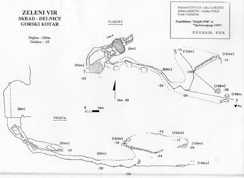 Après plusieurs plongées consacrées à la recherche du conduit principal du fait des conditions de visibilité réduites, Richard HUTTLER, Gilles LORENTE, Gordan POLIC et Frank VASSEUR (expédition Zivjeli 98), portent le terminus à 88m (-32,5).