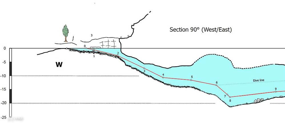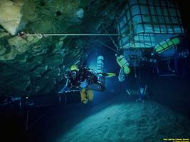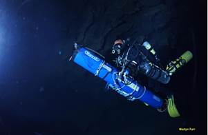effectuée avec un double appareil dorsal de 12 l et deux étages remplis de 36 nitrox. Afin d'optimiser le transport du matériel