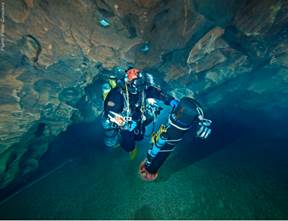 Joaquin et Pedro Plana du service de recherche spéléologique (Servicio de Investigaciones Espeleológicas) effectuent la première plongée au Poozo-Azul, pénétrant jusqu’à 120 mètres de l’entrée à -28
