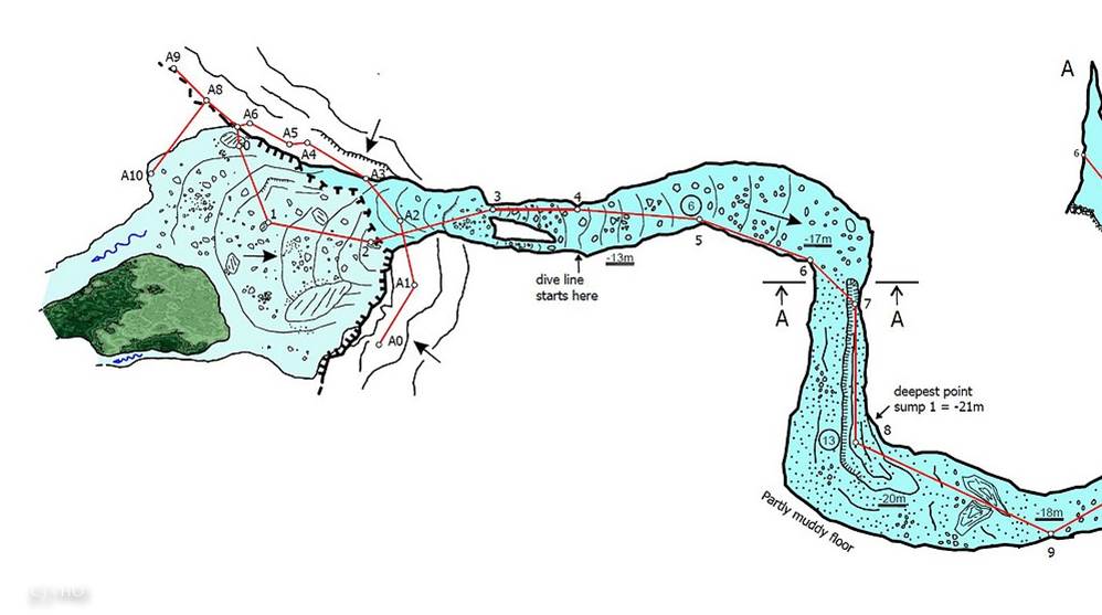 siphon est découvert après plusieurs centaines de mètres. Il y a alors 9375 mètres de siphons immergés pour