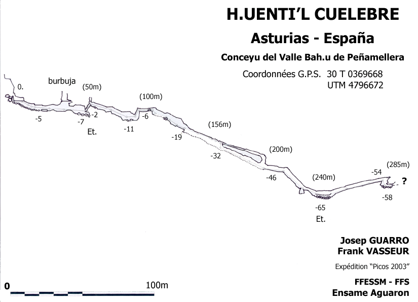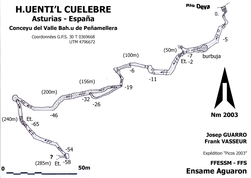 Durant l'expédition hispano-française « Picos 2003 » (Juan-José ALONSO, Oscar CUADRADO MENDEZ, Javier LUSARRETA, Xesus MANTECA, Christian et Delphine Deit, Kino Passevant, Guillaume Tixier, Frank Vasseur) le terminus est porté à 285 m de l'entrée, après un point bas à –65.