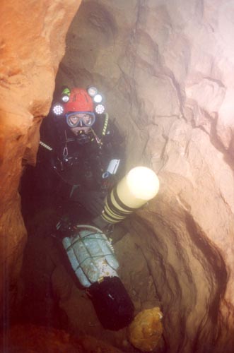 | En descendant au sol, à –7, juste en amont de la grande cloche, la galerie se pince subitement. Une espèce de laminoir étroit et irrégulier, amorcé derrière une lame, bien que ponctuel, impose la configuration latérale pour des volumes supérieurs à 9 litres. On se délivre du réduit à –2, sous le miroir d'une minuscule poche d'air, sans communication avec la précédente. On plonge alors à –11 dans une opulente salle inclinée, avant de remonter à –6 dans une galerie plus intime. Au retour, on pourra effecteur ses paliers ici. |