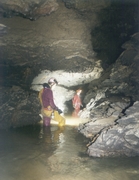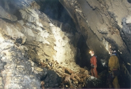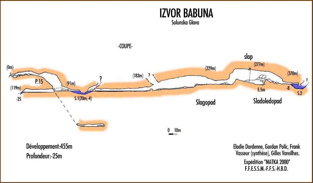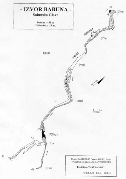 On y accède par le sud, en découvrant le vaste amphithéatre de hautes falaises (750m. de haut environ) calcaires. De Skopje, descendre plein sud la vallée du Vardar jusqu'à Velès qu'il faut traverser. Bifurquer direction sud-ouest puis plein ouest, pour rejoindre Bogomila. Quelques kilomètres après Bogomila, la route goudronnée s'arrête pour faire place à une bonne piste qui s'enfonce dans la montagne. Au détour d'un virage nous apparaît le Massif de Solunska glava dans toute sa splendeur. Magnifique cirque de falaises de calcaire blanc, surplombant les versants de moyenne altitude couverts de forêts, il culmine à 2538 m. Monter pendant 15 à 20mn, jusqu'à un virage en épingle à cheveux, là où la piste quitte le versant gauche du cirque pour repiquer vers le sud. Un panneau indicateur précise l'endroit où deux véhicules peuvent être garés. La marche d'approche se fait par un sentier surplombant le cours d'eau de 50 à 80 mètres, sur sa rive droite. Tracé à flanc de coteau, il monte doucement en sous-bois, avec quelques segments en plus forte pente. On atteint le canyon après 45 min ou une heure de marche. Il faut remonter un talweg escarpé, actif en période de crue, pour atteindre l'orifice d'entrée. En crue, le débit interdit tout accès à la cavité. Historique Un professeur de Mathématiques s'était intéressé au massif de Jakupica, mais ne connaissait pas la grotte. Mai 1970 : découverte de l'entrée et exploration de 38m. de galeries. Arrêt sur un lac. Septembre 1970 : nouvelle reconnaissance, equipé de chambres à air de tracteur. L'étiage est prononcé, dans le talweg, la source est tarie. L'exploration est plus aisée, et se prolonge jusqu'au siphon, partiellement désamorcé. En Août 2000, l'expédition « Matka 2000 » explore 291 m après le franchissement d'un siphon de 20 m (-4). La rivière souterraine coule alors dans des galeries immenses (25m de haut, 8m. de large). Arrêt sur un siphon reconnu en apnée jusqu'à –4m. Description L'article relatif à l'exploration de la cavité, rédigé par Nakov VANE (S.D.Peoni – Skopje) en 1970, sert de base au texte ci-dessous (traduction : Gordan POLIC). La galerie chaotique se développe sur des dalles effondrées dans des dimensions confortables jusqu'au sommet du puits, à une quarantaine de mètres de l'entrée. Les amarrages sont en rive gauche. On descend un plan incliné d'une quinzaine de mètres, qui se verticalise sur la fin. Lors de la première exploration, le lac occupait toute la base de la verticale. A l'étiage, une belle dune de sable plonge dans un lac. En aval, une petite galerie s'engage vers l'Est puis Sud-Est durant 27m. . L'écoulement, audible même en période de sécheresse, disparaît sous une trémie pour alimenter la source du talweg. L'eau est translucide, quelques dépots la troublent légèrement au retour. Le siphon est confortable (3x3m), il plonge à –4 pour un point bas ponctuel et remonte immédiatement (20m. ;-4). On débouche ensuite dans le plus vaste volume de la cavité. Une superbe salle aux voûtes difficilement discernables (hauteur supérieure à 20m.), d'environ 10m. de large, remonte nord-ouest. En descendant en amont du chaos, on retrouve le cours du ruisseau, issu d'un lac, long de 18m., au bout duquel les parois se referment. Observations T° de l'eau = 6°c Des niphargus, agglutinés les uns sur les autres autour de blocs au fond de la rivière, ont attiré notre attention. D'après Gordan, ce comportement inhabituel pourrait correspondre à une période de reproduction. |