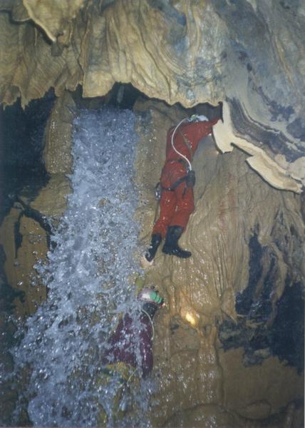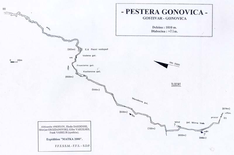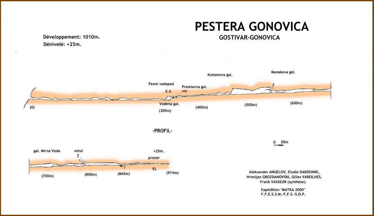 L'entrée fossile de la cavité rejoint rapidement la rivière souterraine. Une succession de jolies galeries aquatiques alternant avec des voûtes basses conduit à la salle de la cascade, à la cote 320m. . Une superbe cascade de 6m. se grimpe en libre avec la bonne vieille technique de la courte échelle. Au sommet, débute la Vodena galerija (gal. Aquatique). Un profond bief, long de 6m, se pince en son extrémité. Une fracture étroite oblige à sortir de l'eau pour une courte reptation. Une courte galerie aquatique enchaîne avec une petite cascade à escalader. On arrive rapidement à une voute mouillante longue de 6m., dont nous avons raboté le plafond pour en faciliter le franchissement. Le courant d'air, ici contraint à s'accommoder du faible interstice dont il dispose, siffle bruyamment et arrive à éteindre les flammes des lampes acétylène. On parcourt alors la Premierna galerija une galerie basse, généreusement et finement concrétionnée, parcourue par l'écoulement. Après un passage bas aquatique, on quitte l'eau pour déboucher dans la Kostenova galerija (gal. de la crème de marrons). Une modeste salle chaotique, propice à la bombance, précède ensuite le « clou » de la caverne. Un ressaut descend dans le collecteur, bien plus confortable (3 x 8m.). A 450m. de l'entrée, débute la Manakova galerija, en hommage à Dusan MANAKOVIC, un géographe macédonien particulièrement actif sur le massif du Bukovic, également un spéléologue actif dans les années 70. La rivière est ici magnifique, entrecoupée de méduses sous lesquelles il faut s'aplatir dans l'eau. Des concrétions, omniprésentes, fines, blanches, agrémentent les parois. A 550m, le plafond s'élève à plus de 12m. et laisse entrevoir ce qui pourrait être une galerie supérieure. En cheminant dans le ruisseau, franchissant par endroit des cascatelles, on arrive à la cote 800. Là, une cheminée latérale, d'où provient un courant d'air perceptible, devrait livrer l'accès à quelque chose d'intéressant au-dessus. En effet, la cavité se dirige droit sous le point culminant du massif (1528m). Le potentiel spéléologique, entre ce sommet (tepe) et l'entrée de la cavité dépasse 500m. L'eau devient calme, et c'est un long bief qui conduit à 865m. Là, la profondeur du bassin augmente, et en rive gauche, une vasque circulaire, d'où provient l'écoulement annonce le siphon terminal. Il a été plongé en apnée jusqu'à 4m, où le conduit s'horizontalise et se prolonge. Une galerie latérale, la Nikola Gordan galerija (du nom de ceux que n'a pas rebuté le passage de l'étroiture terminale), prolonge encore un peu la caverne. Le sol est argileux, un filet d'eau coule dessus. 50m. plus loin, une étroiture précède les 40 derniers mètres de reptation jusqu'au retrécissement final impénétrable.