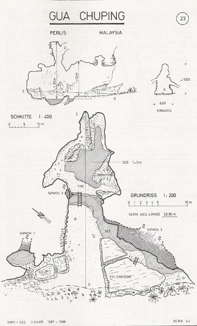 La topo de la partie sèche donne 29,80m de développement. Les siphons restent a explorer. Topo O.Knab 1987.