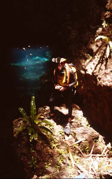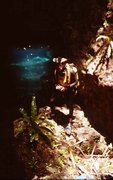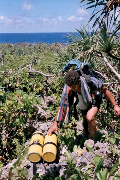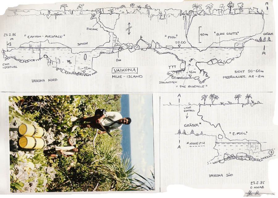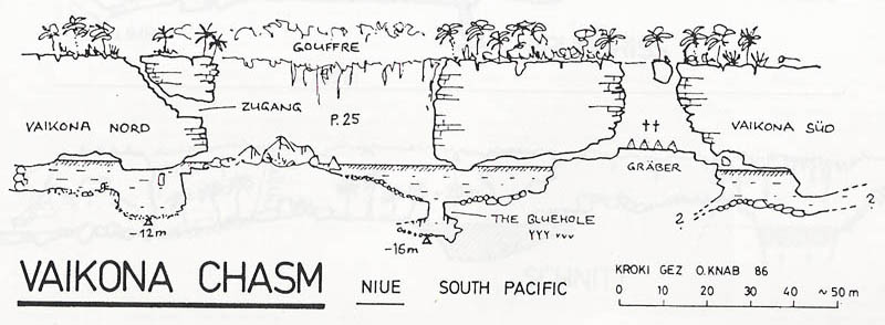 Exploré en solitaire lors d éxpedition ASMF 86 par Oliver Knab le 23.2.1986. Puits 30x 15m (P25),Lac 30x 10m, Vaikona sud : Bluehole avec concrétions, profondeur maximale -16m.Siphon sud longueur ca . 8m traversé ; deuxième Gouffre avec tombes préhistoriques ( Makeitu ). Deuxième siphon pas exploré. Poissons d eau douce couleur brun . Vaikona nord : Siphon de 15m , profondeur -12m,canyon et cloche d'air . Arrêt sur éboulis a 35m de distance. Visibilité 50 -60 mètres . Eau douce de 0m jusqu'à -8m. Eau salé (mer) de -8m jusqu à -16m . |