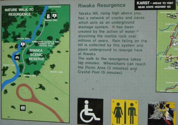 Situation : Au Nord de l'ile du Sud de la Nouvelle Zélande, à environ 57 kms de la ville de Nelson. Cette résurgence redonne les eaux du plateau karstique de Takaka Hill situe à 600 m au dessus de la mer. C'est dans cette region que se trouve les plus profonds avens de NZ ( Mt Arthur, Nettlebed cave -889 Mt ). Ce site est facile d'accès et les nombreux touristes peuvent venir visiter la résurgence. Des panneaux explicatifs sur le fonctionnement de la source et du systeme karstique sont présents sur le chemin d'accès. Le site est aussi prisé des plongeurs mers, qui découvrent une belle salle concretionnée derrière un S1 sans grande difficulté. Néanmoins, en 2003, 3 plongeurs sont restés coincés post siphon suite à une panne d'éclairage, les secours les ont ressortis après 6 heures d' attente. Une mise en garde est présente sur un des panneaux pour avertir des dangers de la plongée spéleo. Descriptif : Présence de belles anguilles dans le S1. Liens : http://caves.org.nz/ Retranscription des panneaux présents sur le chemin d'accès : Diving in this cave can be hazardous, emergency contact police N° 34...