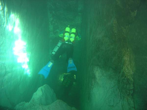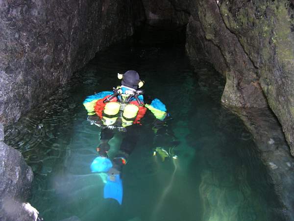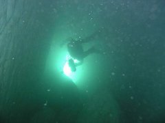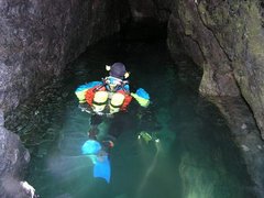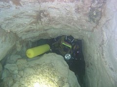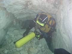 A –10, une étroiture requiert un décapelage. 30m plus loin, le passage devient impénétrable à 40 mètress de l'entrée, par 17,5 mètres de fond.
