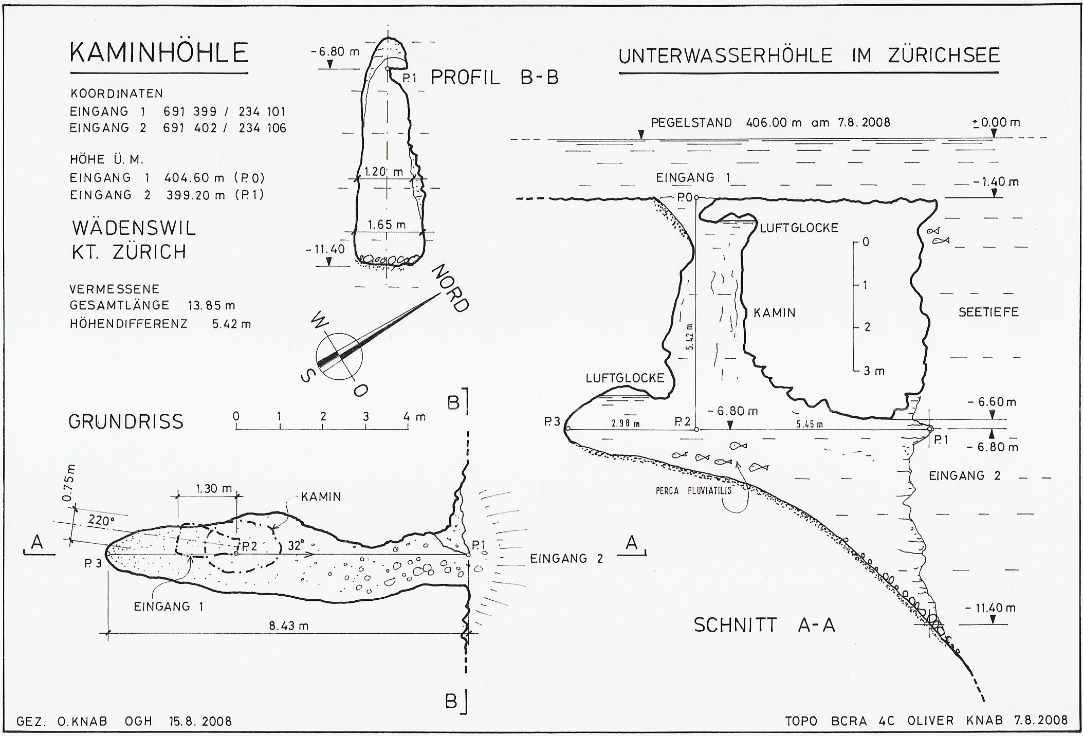 situation : cartes topographiques suisses 2 1 : 25000 feuille 1112 St~fa Relevé des données topographqiues BCRA 4 C le 7.8.2008 : Oliver Knab , Ostschweizerische Gesellschaft fur Hôhlenforschung OGH. |