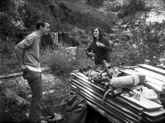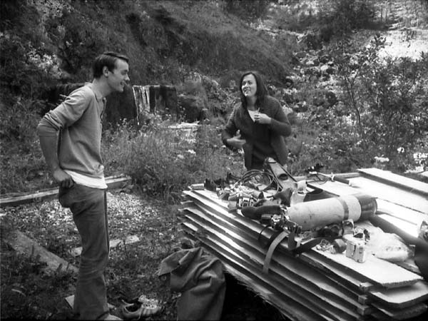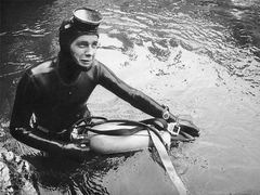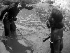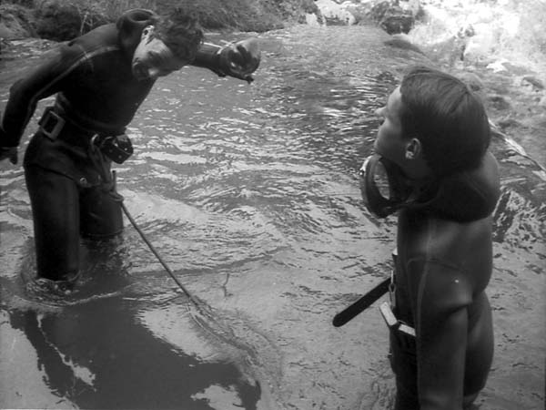 Pierre Martin, au moment des préparatifs, sous le regard d'une équipière non-spéléo du Centre de Sports Sous-marins de Lausannne, Mary Blackmore. Photo Cyrille Brandt. 27 juillet 1971 Cyrille Brandt, dans la vasque, vient de retrouver la surface, et explique à Pierre la position à adopter dans l'étroiture à la base du puits d'entrée. Photo Mary Blackmore. 27 juillet 1971 Pierre Martin, dans la vasque de la source, il vient de refaire surface. Photo Cyrille Brandt. 27 juillet 1971 |