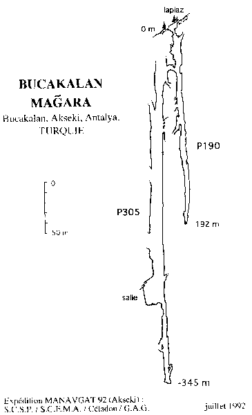 Situation Entrée à l'aplomb du village de Bucakalan, sur une colline bien marquée. Historique Exploré en juillet 1992 par l'expédition Manvgat 92. Description Deux grands puits parallèles colmatés par du concrétionnement. Ils constituaient les deux plus grandes verticales de la Turquie à l'époque |