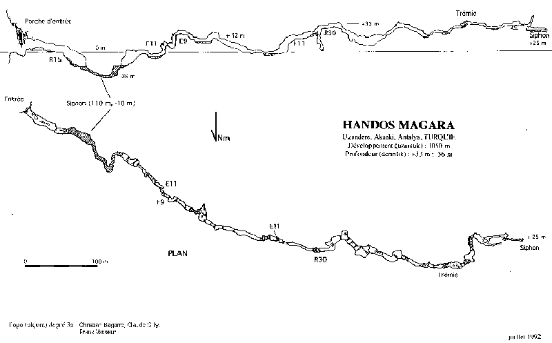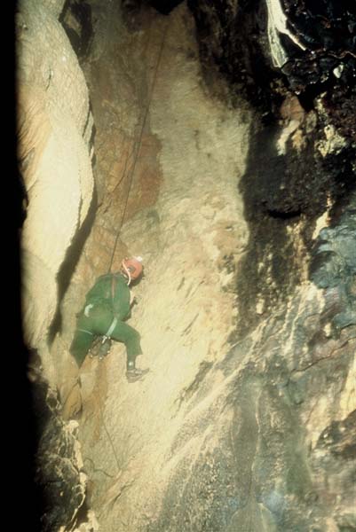 Le siphon (120m;-18, température=14° excellente visibilité) sur 60m (-18) se présente sous la forme d'un laminoir, puis rapidement nous nous trouvons au pied d'un grand puits toujours noyé. Une courte galerie à –3 nous dépose en bas d'une galerie remontante. Ici nous déposons les bouteilles (d'air, pas de rouge) ,les palmes, le sécateur, le profondimètre, la boussole, le masque, le caisson étanche, bref la panoplie complète du parfait spéléonaute pour se transformer, comme Superman, en spéléologue. Une fois l'acéto allumée, nous nous ruons vers la première, mais un premier lac calme nos ardeurs.