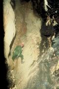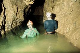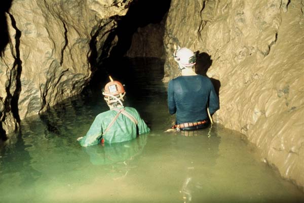 Mais une nouvelle escalade nous ferme la route de la découverte, ce coup-ci, nous sortons le tapis volant et 9m plus haut, nous « renquillons » la galerie. Une petite trempette, un peu de marche à pied toujours dans des galeries généreuses (5 x 5m) et encore une escalade. Mince (ça veut dire merde en français lyrique), nous avons oublié le tapis volant en haut de l'escalade de 9m. Nous remettons les chaussons d'escalade et nous voilà en haut. Peu après, nous arrivons dans une grande salle encombrée de puissants colmatages argileux. Plus on avance, plus le réseau prend des dimensions intimes. Un petit lac, une trémie, puis nous butons sur un siphon. Kermit tentera une plongée en apnée, mais en vain, c'est fini pour nous. |