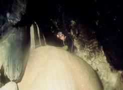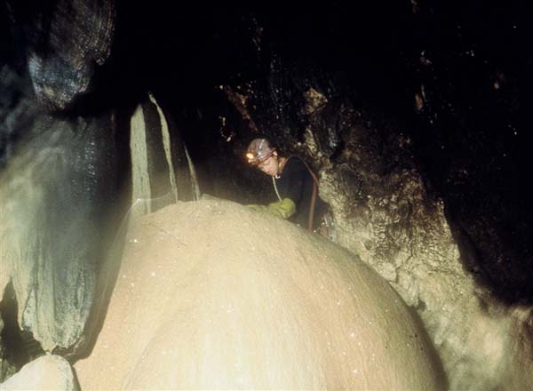 Cela fait un an que nous attendions ce moment, vous ne pouvez pas comprendre. Rapidement, une cascade de calcite nous barre la route. Le moralomètre toujours optimiste, Enzo plante une paire de spits foireux, effectue un lancé de sangle folklorique et l'obstacle est déjoué. Deuxième épreuve, une étroiture ; Nous avons parcouru 4000 km pour casser une étroiture derrière unsiphon, même en France on ne le fait pas. Kermit se défoule sur le retrécissement qui ne fera pas long feu. Derrière, la grotte est très belle : formes très lisses, coulées de calcite aux formes très contrastées qui brillent en myriades d'étoiles à la lueur de nos regards.