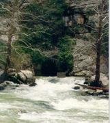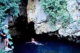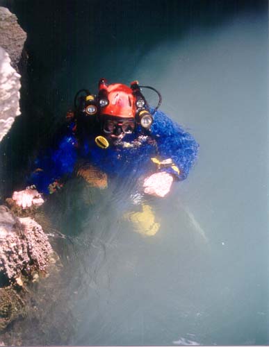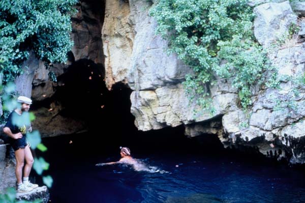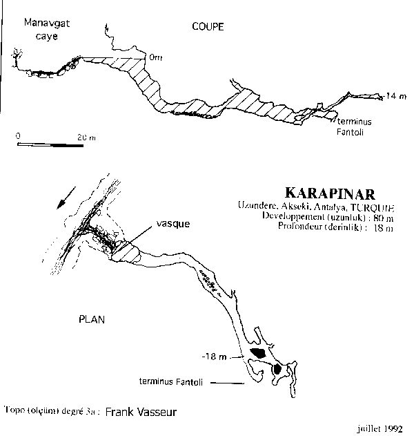 La puissante vasque émissive peut gêner la mise à l'eau selon l'intensité du débit. Nous sommes descendus dans le conduit en rasant la paroi afin de s'opposer du moins possible au courant. A -14, on s'engage dans la galerie en se tractant sur les blocs et lames d'érosion jusqu'à une légère remontée à 40m de l'entrée. A ce niveau, un départ en rive droite bute rapidement et une remontée dans la fracture qui détermine la cavité bute à -6 sur rétrécissement. En gardant la rive gauche, on atteint le terminus de Jean-Louis FANTOLI (50m de l'entrée) dans un décollement de fracture. La continuation est découverte dans le sol de la galerie, à la côte 45m sous un gros bloc. Par une série de passages bas et tortueux, on parvient à 60m dans un élargissement sur lequel se greffent plusieurs fissures impénétrables d'où provient le courant. L'une d'elles est franchie en décapelé, et 20 mètres explorés de la sorte dans des boyaux débouchant sur un cul-de-sac. Arrêt à 80m de l'entrée à -14.