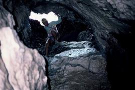 Un porche en tête du ravin livre l'accès au plan d'eau confortable, prolongé par une galerie débouchant dans une salle concrétionnée.