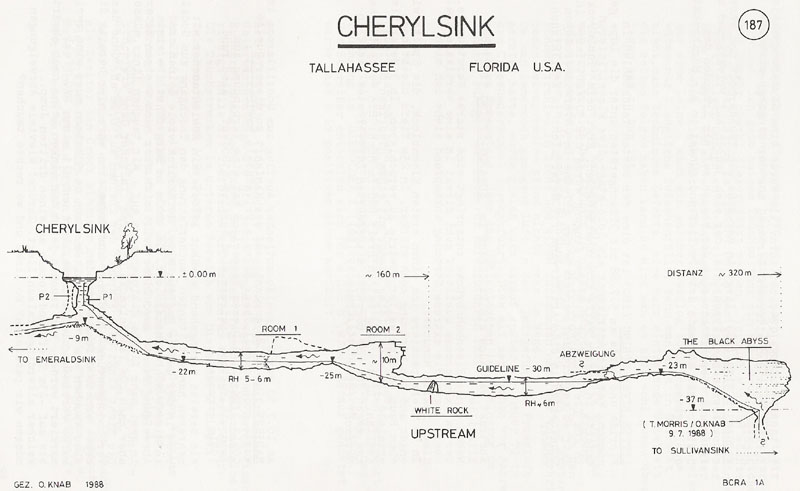 Le plan est le résultat d' une simple visite jusqu'à Black Abyss, Distance 320m, Profondeur –35m ( Tom Morris / Oliver Knab, 9.7.1988)