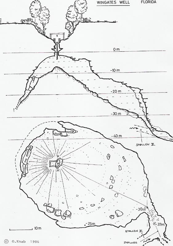 Plongée le 28.5.1986 par Arwyn Carr et Oliver Knab jusqua – 37m. Entrée curieuse avec puits trés étroit à traverser en monobouteille.