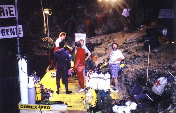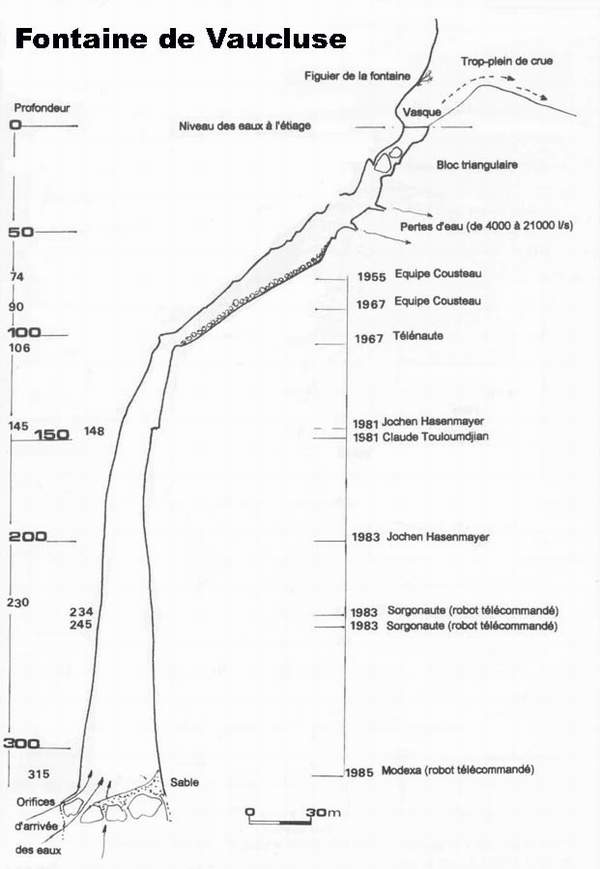 Historique - 26 et 27 mars 1878 : Nello Ottonelli , scaphandrier du port de Marseille, explore la source jusqu'à 23 mètres de profondeur. - 24 septembre 1938 : Negri , autre scaphandrier de Marseille atteint la profondeur de 30 mètres. Au cours de sa descente, il repère la barque d'Ottonelli coulée en 1878. - 27 août 1946 : J.Y. Cousteau et F.Dumas , accompagnés de G. Morandière et P.Taillez , tous membres du Groupe d'Etudes et de Recherches Sous-marines ( GERS ) poussent l'exploration jusqu'à 46 mètres de profondeur. Il s'agit des premières plongées en scaphandre autonome. - 16 août 1955 : Les plongeurs de l'Office Français de Recherches Sous-marines parviennent à 74 mètres de profondeur avec vue sur 85 mètres. Les spéléos de la Société Spéléologique de Fontaine de Vaucluse ( créée deux ans avant ) participent aux travaux. - 1967 : Le Cdt Brennot de L'OFRS immerge un appareil télécommandé depuis l'extérieur. Le Télénaute de l'institut de recherche pétrolières descendra à 106 mètres. Au cours de cette expédition , le plongeur Falco ( futur capitaine de la Calypso) réalise une plongée à 90 mètres en scaphandre autonome. L'infrastructure de surface est assurée par les spéléos de la Société Spéléologique de Fontaine de Vaucluse . - 1974 : Des plongeurs d'Angoulème réalisent une topographie jusqu'à 78 mètres de profondeur. Leur but commercial inavoué, conduit la municipalité à interdire toute plongée . - septembre octobre 1981 : C.Touloumdjian grâce aux nouveaux mélanges gazeux et la technicité de La COMEX réalise une plongée à 153 mètres de profondeur. Sans autorisation et sans autre soutien que sa femme, et quelques jours avant Touloumdjian, l'allemand Hasenmayer réalise une plongée à 140 mètres. - en 1982 : J.P. Viard , du CE de Renault , propose de construire un robot spécial. Le Sorgonaute est né. - 9 septembre 1983 : Hasenmay er revient en solitaire et plonge à 205 mètres de profondeur. - 17 septembre 1983 : Sorgonaute filme le gouffre jusqu'à 243 mètres de profondeur. Il stoppe par manque de câble. - 22 septembre 1984 : Sorgonaute II est perdu aux alentours de 233 mètres. - 1985 : la SSFV ( Société Spéléologique de Fontaine de Vaucluse ) monte une nouvelle expédition. L'opération Spélénaute 85 voit le jour grâce au soutien de la Mairie de Fontaine , du Conseil Général de Vaucluse , de la Caisse d'Épargne et de tous les bénévoles du club. Le Modexa , loué à la société M.I.C de Marseille, est mis au point et réglé dans les ateliers Mahieu de L'Isle sur Sorgue. - 2 août 1985 : le Modexa est immergé et se pose après 3 heures d'exploration sur un fond sableux par 315 mètres de profondeur. Il s'agit du terminus actuel. - 22 et 23 septembre 1986 : JP.Viard revient avec un Sorgonaute III tenter de récupérer Sorgonaute II. L'affaire tourne au cauchemar et malgré tous les efforts l'engin disparaît à son tour, laissant derrière lui 150 mètres de câble coincés dans le gouffre. - 23 août 1988 : Sorgonaute IV, engin de secours, réalise une expédition sans succès pour récupérer ses prédécesseurs. Viard arrêtera là la saga des Sorgonaute. - 9 septembre 1989 : La SSFV monte une nouvelle expédition. Il s'agit désormais de prendre l'ensemble des commandes en mains. L'opération Spélénaute 89 voit le jour grâce au soutien du Conseil Général de Vaucluse , de la Caisse d'Épargne , de la Société CMC Mahieu , de la COMEX, du Lion's club de l'Isle et de tous les bénévoles du club. Désormais le club de Fontaine de Vaucluse possède son propre engin, dédié à la source. Spélénaute réalise une belle plongée d'exploration et atteint le terminus de 1985. Son aisance lui permet de filmer nombre de détails . - 18 septembre 1993 : deuxième expédition pour le Spélénaute de la SSFV . Il s'agit désormais de topographier, d'observer finement. On réalise par la même occasion quelques images avec N.Hulot pour l'émission Ushuaia. Malgré quelques accrochages de l'ombilical , l'expédition se passe sans trop de problèmes. - du 7 septembre au 13 octobre 1996 : troisième expédition pour le Spélénaute . : la SSFV ( Société Spéléologique de Fontaine de Vaucluse ) veut poursuivre l'observation fine du gouffre et la topographie commencée en 89. Pour cela , le Spélénaute est amélioré. Malheureusement , un fil d'Ariane viendra le bloquer par 164 mètres de profondeur. La COMEX avec un deuxième robot ne pourra pas le dégager et seule une intervention humaine ( plongeurs spéléologues de FFS ) permettra de récupérer les deux engins. - mars 1998 : la SSFV ( Société Spéléologique de Fontaine de Vaucluse ) monte un dossier de prospections archéologiques. Aux records éphémères et dangereux, elle préfère la recherche scientifique dans le seul but de faire avancer la connaissance de la Fontaine de Vaucluse . - 24 au 31 août 2001: La SSFV organise des plongées de prospections avec le Spélénaute dans la zone s'étendant de 40 à 80 mètres de profondeur. L'objectif est d'observer sans risque cette portion de la cavité et de repérer d'éventuels dépôts mobiliers. Les découvertes très importantes nécessiteront de réaliser des plongées complémentaires sous l'égide de la Direction régionale de l'archéologie sous-marine (Drassm Marseille) Une mission d'évaluation est réalisée sous l'égide du Ministère de la Culture et devant l'importance des découvertes prend des mesures de protection du gouffre. -15 au 31 août 2003 : En collaboration avec le SRA , la SSFV permet la récupération d'environ 400 pièces antiques parmi lesquelles certaines sont de grande valeur. Des chercheurs de l'Université de Nice et de Paris 8 , participent à cette opération et souhaitent collaborer pour divers projets. -15 au 31 août 2004 : un deuxième chantier archéologique est mené avec le Ministère de la Culture. Il permettra de porter le nombre de pièces et d'objets à p