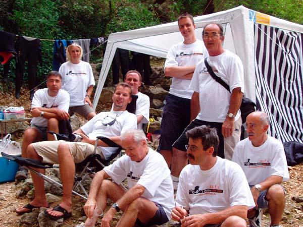 Equipe de la ssfv en 2004 - archives ssfv Fontaine de Vaucluse - vue aérienne Barque et début du redan, par Frank Vasseur Barque par Andrey Bizukin. Gravure archives ssfv Vasque - archives ssfv