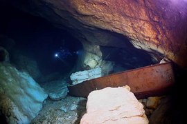 ArchéologieLa gravure de 1683Cette gravure est certainement la plus ancienne marque des variations de niveau dans le gouffre. Elle était initialement composée de deux parties. Il ne reste aucune trace de la deuxième partie qui daterait du 20 septembre 1683 et aurait été positionnée à gauche du figuier légendaire, marquant probablement un niveau maximal de l'ordre de 22 mètres au dessus du zéro. La première partie est constituée d'une croix byzantine qui marquait le niveau bas. Le 23 mars 1683, le niveau descendit si bas ( 21 mètres au dessous du figuier ) que le Vice Légat du Pape Nicolini, accompagné du peintre Nicolas Mignard demanda au sculpteur P.Thibault de graver cette inscription à jamais dans un rocher. « 1683 die 23 mart. Abbate Nicolino Pro Le. Aven. Quatuor palmis inferius descendit . » « le 23 mars 1683, l'abé Nicolini, prolégat d'Avignon, (l'eau) est descendue de 4 pans plus bas ». Cette inscription connue et décrite, disparaît pourtant des récits vers la fin du 19 ème siècle. Il semble assez logique que le tremblement de terre de 1907 qui détruisit une partie de Lambesc dans les Bouches du Rhône voisines ne soit pas étranger à l'affaire. Ce rocher de plusieurs dizaines de tonnes tomba dans le gouffre et gise maintenant par 15 mètres de fond. Il a été re-découvert par R.Lepennec plongeur spéléo jurassien. Sa position à l'envers et inclinée vers le bas l'a préservée parfaitement des chutes de pierres. La croix reste très lisible aujourd'hui encore. La BarqueLa Fontaine de Vaucluse a aussi son épave. Allongée par 25 mètres de profondeur sur le côté gauche de la salle qui porte son nom, une barque métallique de près de 5 mètres de long repose dans le noir. Elle gît à moitié ensevelie sous des blocs énormes et l'équilibre de l'ensemble est incroyable. Un jour ou l'autre, il est certain qu'elle partira vers le fond, effaçant ainsi les dernières traces du passage d'Ottonelli. Il semble qu'elle ait été perdue ou abandonnée à la fin de la plongée du marseillais Ottonelli. C'est en 1878 que le scaphandrier s'aventura jusqu'à cette profondeur, ce qui constitue un exploit extraordinaire. Cette première expédition dans la Fontaine de Vaucluse fut organisée par le syndicat du canal de Vaucluse sur l'impulsion de l'ingénieur en chef Marius Bouvier. Il faut se souvenir qu'à cette époque, les scaphandriers marchaient grâce à de lourds souliers de plomb car il leur fallait tenir droit. On les appelle aujourd'hui encore les pieds lourds. L'air était injecté dans un casque depuis la surface grâce à des pompes qui devaient tourner en permanence et une corde de sécurité maintenait un contact aussi direct que possible avec le scaphandrier. La salle de la barque n'est pas à l'aplomb de la sortie et on imagine que son embarcation de soutien devait le suivre difficilement depuis la surface de a vasque. A la lecture de son récit on se demande si Ottonelli a parcouru la galerie abrupte que nous connaissons aujourd'hui. Certainement pas et il faut là aussi rapprocher cette supposition de l'affaire de la gravure disparue. Il raconte ainsi s'être avancé pratiquement jusqu'au seuil où repose actuellement la barque puis voyant le noir impénétrable devant lui l'aurait sondé à l'aide d'un boulet accroché à une corde. Le « tombant » fait une dizaine de mètres et il a été très prudent de ne pas s'y aventurer. En revanche il aurait pu voir dans la lueur de son faible éclairage le gisement de pièces antiques de chaque côté de lui. En tant que pionnier de la recherche subaquatique dans la Source il mérite un hommage appuyé. Le TrésorLes légendes ne manquent pas et la part de rêves qu'elles amènent est souvent un puissant moteur de la motivation. Dans ce site légendaire, tout est à la mesure de cette source, c'est à dire que tout y est finalement démesuré. S'il est bien une légende qui travaille encore plus l'imaginaire que les autres, c'est celle qui évoque l'existence d'un trésor. Les plongeurs de la Société spéléologique de Fontaine de Vaucluse, ne sont pas des chasseurs de trésor mais le rêve n'est jamais interdit. En 2001, lors de plongées de prospection, deux d'entre eux Roland PASTOR et Thomas SOULARD, découvrent un important gisement de pièces antiques. Elles s'étalent du I° siècle avant JC au V siècle de notre ère. Des centaines de pièces de bronze et parmi elles, de belles pièces d'argent et d'or. L'or ! Ce mot si évocateur suffit à imaginer la joie immense des découvreurs. Rien que cet aspect de la découverte doit nous montrer à quel point la Source, cette Source était vénérée par nos ancêtres et mérite d'ailleurs toujours de l'être. Les déclarations légales faites, le site fut classé site archéologique et incite à un respect particulier . Le chantier de fouilles nécessita le travail de douze plongeurs pendant près de trois semaines étalées sur deux années C'est au rythme de deux plongées par jour pour chaque personne, que les plongeurs bénévoles ont travaillé sous la direction du Drassm (Y.Billaud). Des photographies, des mesures, des moulages ont précédé la précieuse récupération . Avec la Commune, nous souhaitons vivement que le Trésor soit exposé à Fontaine de Vaucluse, au sein même de ce lieu de légende. Le trésor existait donc bel et bien ! Il était là, depuis longtemps sous nos yeux, caché dans les replis de ce gouffre immense. Jusqu'alors, les plongées avaient eu pour but de comprendre le phénomène, le fonctionnement de ce système karstique et surtout de trouver une suite au réseau. Le siècle précédent était tout entier tourné vers le triomphe de la technique. Le nouveau sera peut être lui plus centré sur l'Homme, la compréhension de ses origines et de ses racines, de ses pratiques cultuelles. |