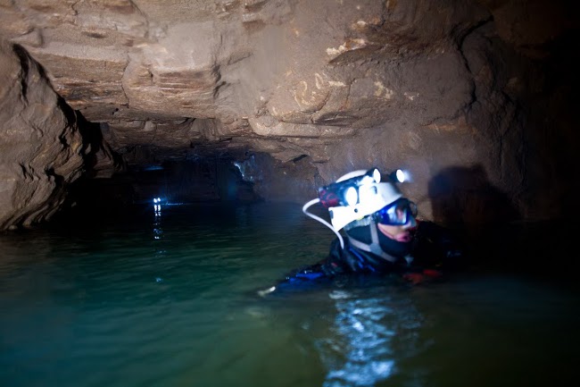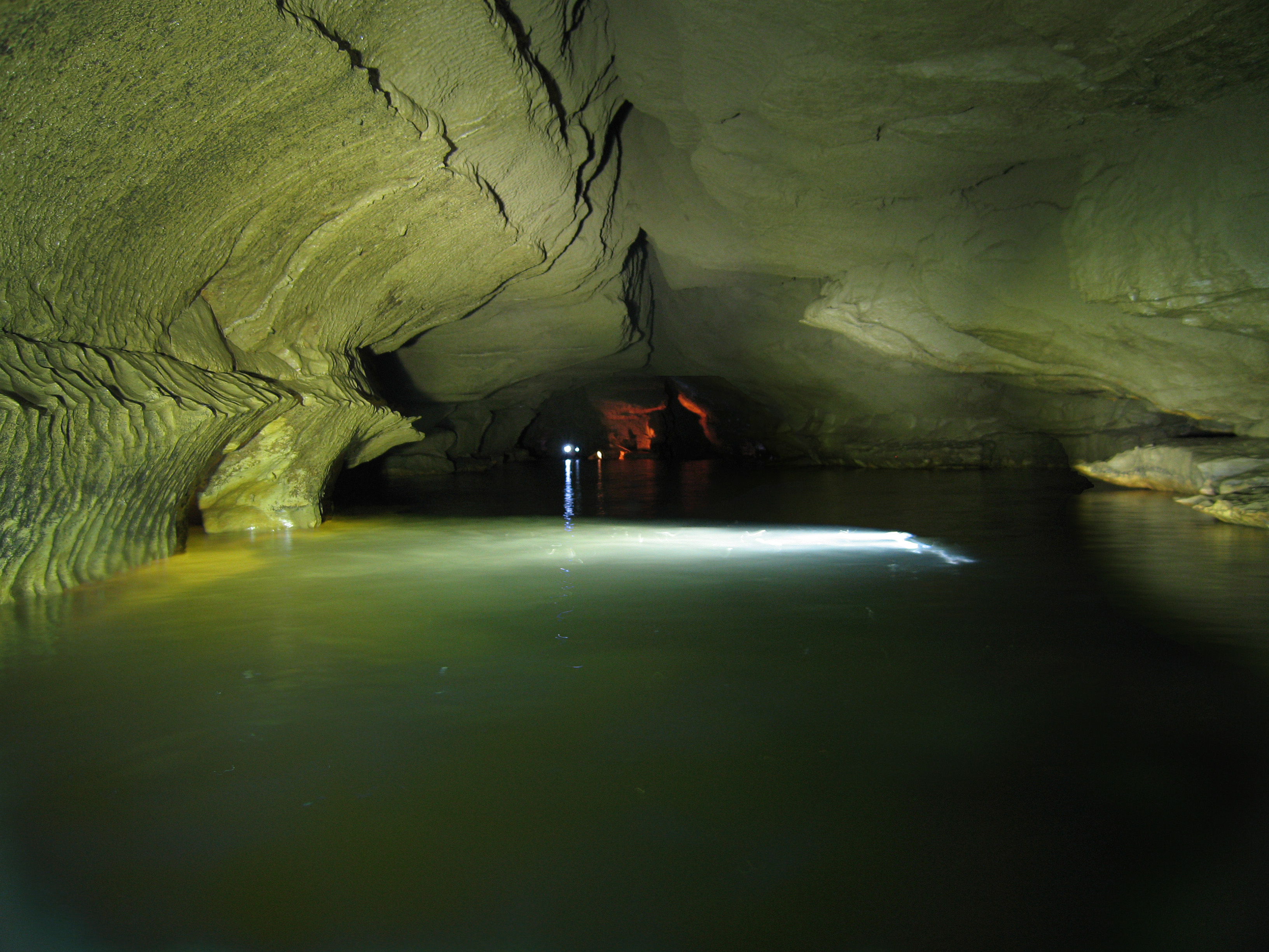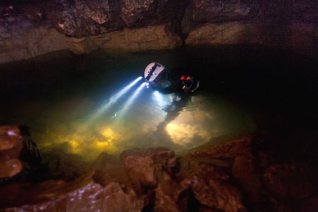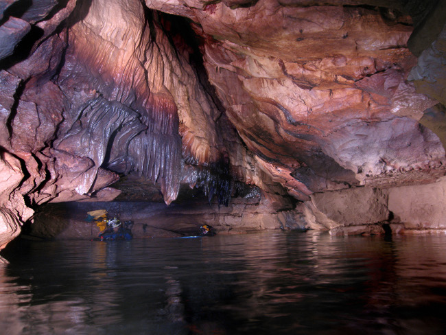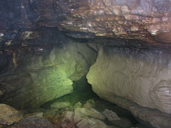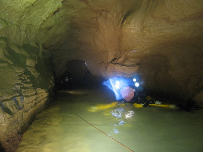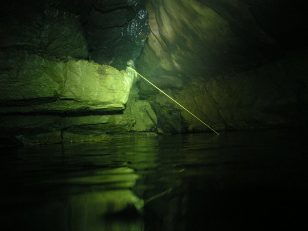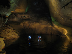 Le siphon n°12, part juste en face. Il ressort avec une nouvelle progression dans la rivière souterraine, pour enfin donner accès au dernier siphon exploré à ce jour : le S12. Les dimensions des galeries à partir du S7 oscillent entre 3 et 4 mètres de large pour 2 à 3 mètres de haut.