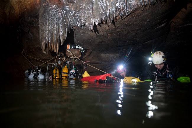 Le passage entre le S3 doit se faire par une trémie assez intime (blocs montés en latéral obligatoire). Entre le S3 et le S 4, il est possible de sortir dans une belle salle avec un beau lac. Au bout du lac se situe une première salle d'effondrement. Le passage entre ces deux siphons peut se faire sans sortir de l'eau.
