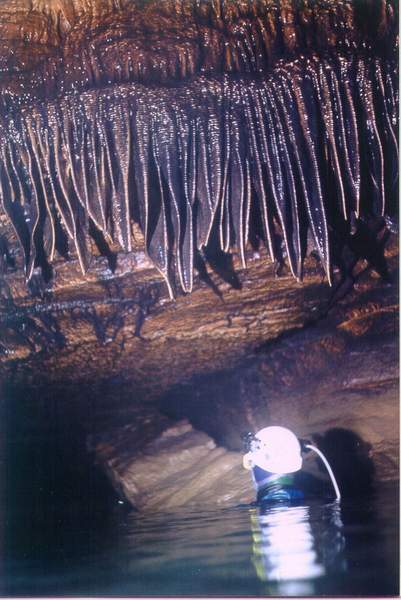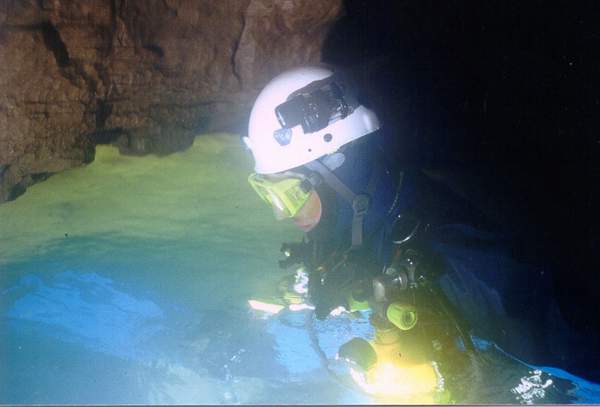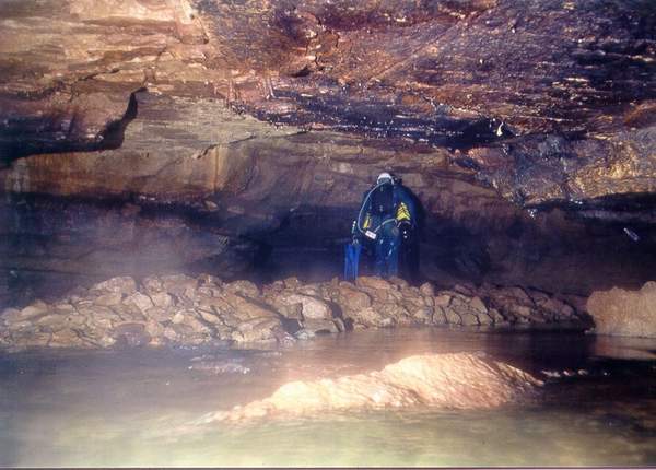 1998. Philippe Wohrer plonge plusieurs fois dans la grotte. Accompagné de Nicolas Maigan qui trouve le passage dans une trémie composée de blocs imposants. Ils ressortent dans la Salle 4.