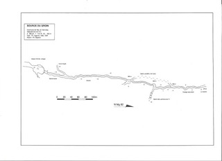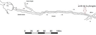 Selon le niveau d'eau au moment de la plongée, la cavité se découpera en 6 siphons dont le premier se termine à 1200m de l'entrée. (S6 inconnu, arrêt sur rien)